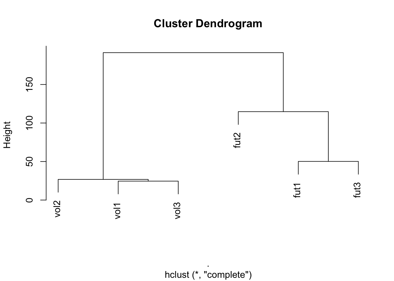 A forma mais simples de se fazer uma análise de cluster é utilizar métricas de similaridade, que indicam o quanto um objeto é próximo de outro, e assim traçar um dendrograma, que é um gráfico que indica o quão semelhante cada objeto é entre si e como a estrutura de grupos se apresenta. Veja o código abaixo e a saída na forma do dendrograma: