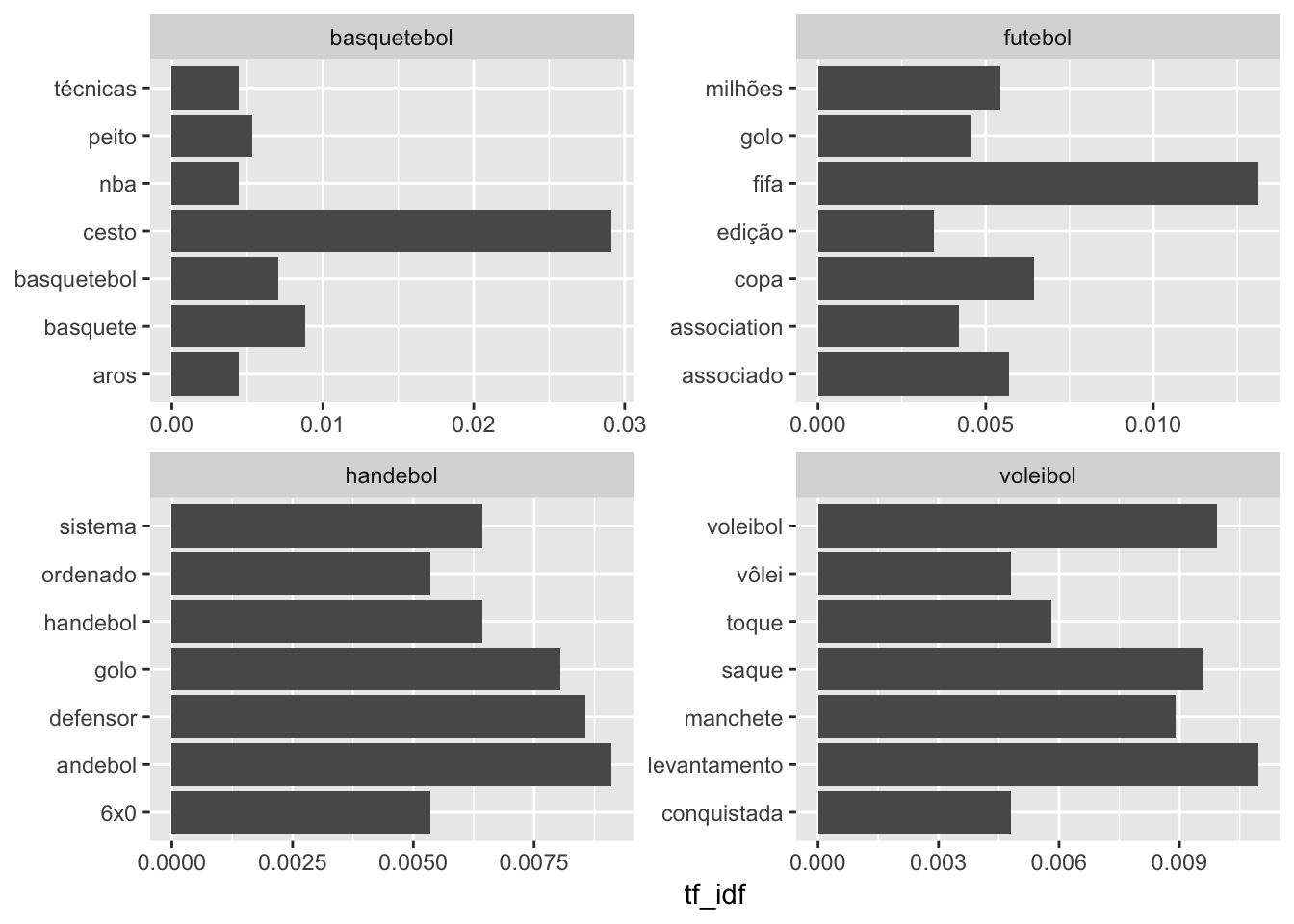 Note que os resultados acima são bem mais interessantes do que a simples frequência de palavras do artigo anterior. Especialmente para o voleibol, por exemplo, com os termos técnicos de cada fundamento/movimento do jogo.