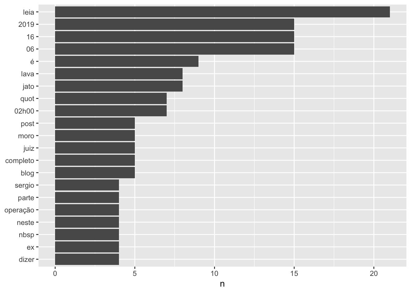 Como você pode notar, a coluna item_date_published vem no format DateTime, que possui a data e o horário exato da publicação. Neste caso, para facilitar a filtragem, usei a função as.Date() para converter para Date e aplicar o filtro. Em seguir, aplicando o que já aprendemos nos artigos anteriores para entender a análise de frequência de palavras: